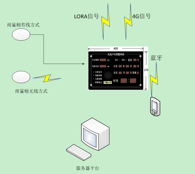 本產品為入戶報警器家庭版,需要配合我司雨量桶使用,系統(tǒng)組成應用圖如下圖所示: