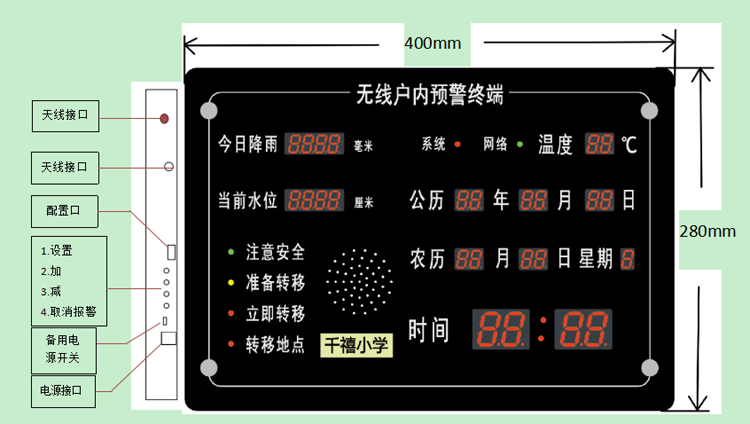 產品采用與家庭日常用品相結合的親民形式,具有公歷、農歷、時間、星期、溫度等居民日常常用信息的顯示功能,可提高居民對設備維護的重視程度,便于居民及時掌握預警信息。